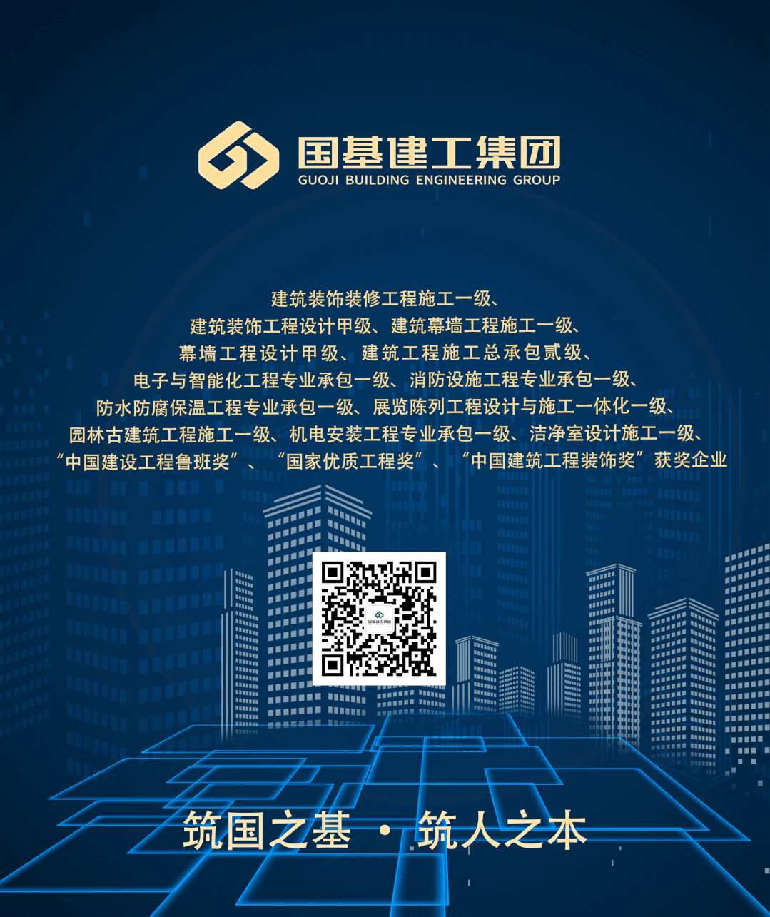 ![]() 国基建工集团创立于1995年,经过28年稳健发展,已经成长为一家拥有室内装饰、室外幕墙、地产精装、展览展陈等四大板块、一个设计中心、五位一体的综合性工程建筑发展商。 ![]() ![]() ![]() ![]() 公司具有国家建筑装饰装修工程施工一级、建筑装饰工程设计甲级、国家建筑幕墙工程施工一级、幕墙工程设计甲级资质、展览陈列工程设计与施工一体化一级资质、洁净室设计施工一级资质、园林古建筑工程施工一级资质、建筑机电安装工程专业承包一级资质、防水防腐保温工程专业承包一级资质、电子与智能化工程专业承包一级资质、消防设施工程专业承包一级资质,建筑工程施工总承包贰级,同时具备市政公用工程、钢结构工程、环保工程、结构补强、特种防雷等资质。