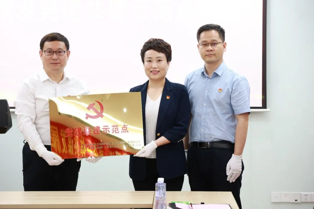 会议议程第六项,由河南省住建厅机关党委专职副书记杨亮颁发“党建共建示范点”牌匾,河南省住房保障和房地产业发展中心主任吴小红、河南国基建工集团有限公司董事长付咏接受牌匾。